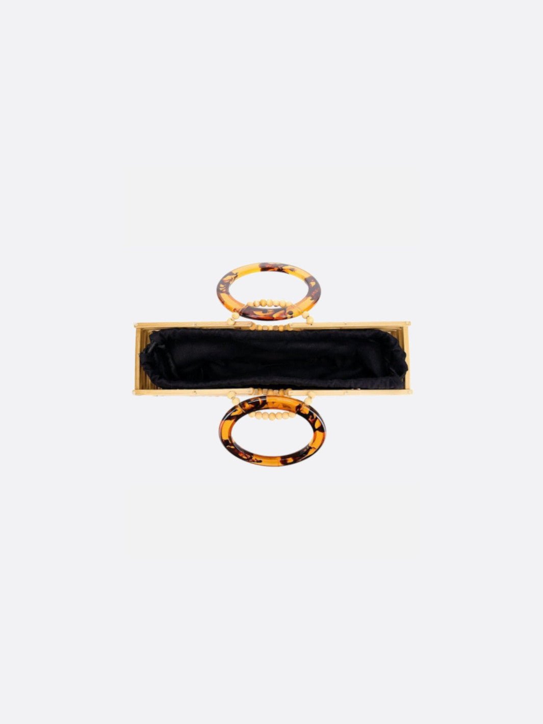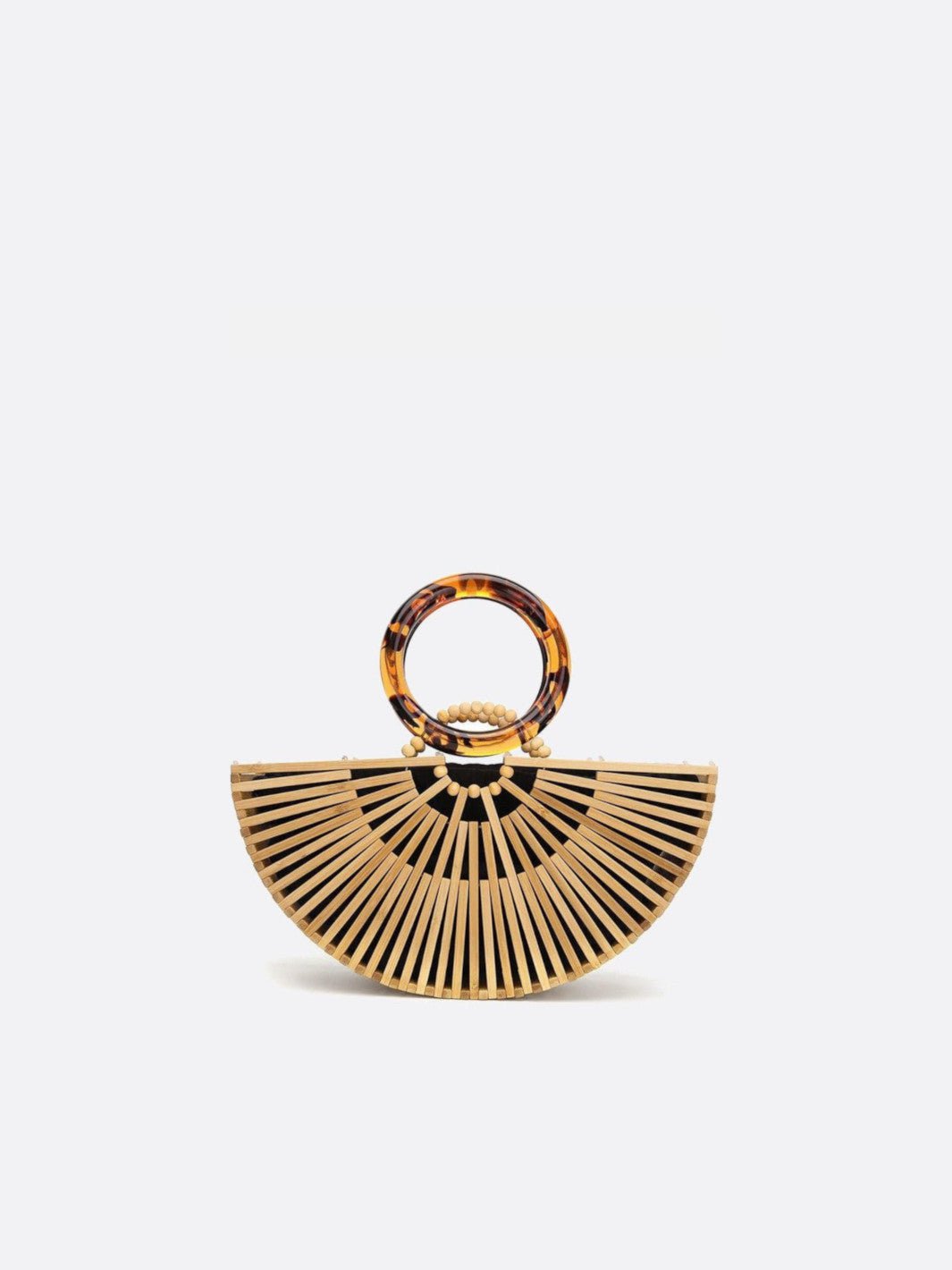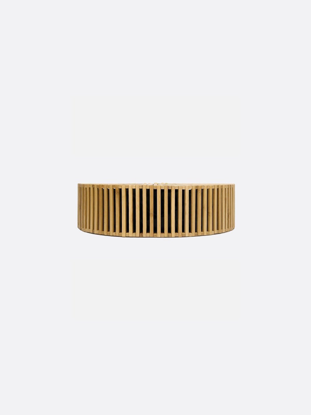 Ce sac demi-lune en bambou séduit par son allure sculpturale et son design ajouré qui joue subtilement avec la lumière. Sa structure élégante met en valeur la beauté naturelle de la matière, tandis que sa poignée circulaire lui confère une touche contemporaine et raffinée.