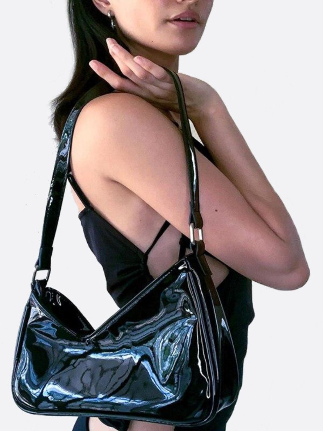 Un jeu de lumière et de reflets accompagne chaque mouvement de ce sac noir vernis, pensé pour illuminer vos tenues avec audace. Sa ligne épurée et son fini miroir lui confèrent une allure moderne et affirmée, idéale pour les soirées comme pour les instants du quotidien où l’on souhaite briller.