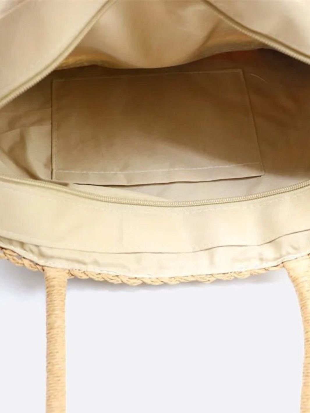 À l’intérieur, on retrouve un compartiment spacieux doublé, accompagné d’une poche plate pour vos essentiels. Sa fermeture éclair assure la sécurité de vos effets personnels, sans compromettre son style estival.