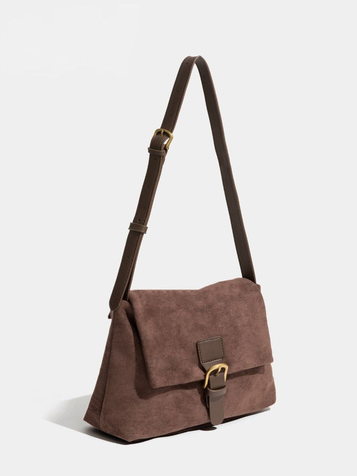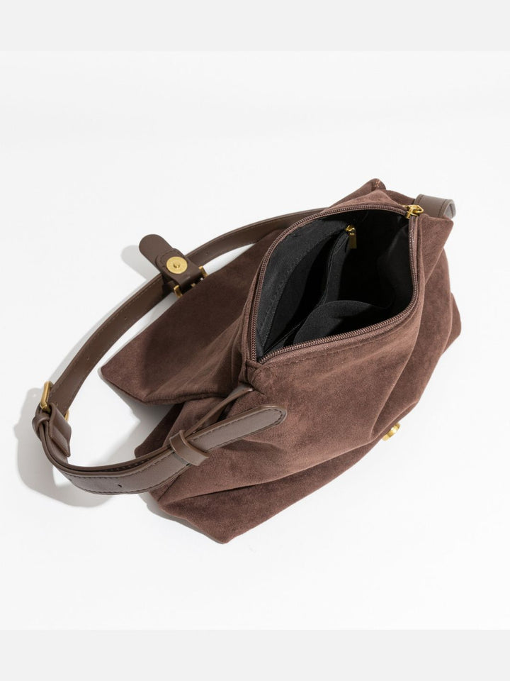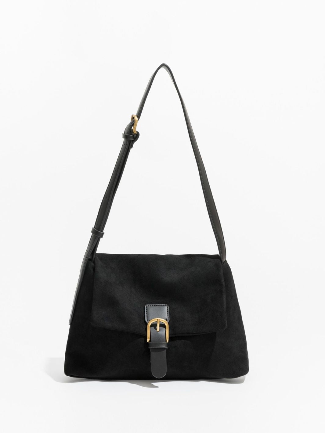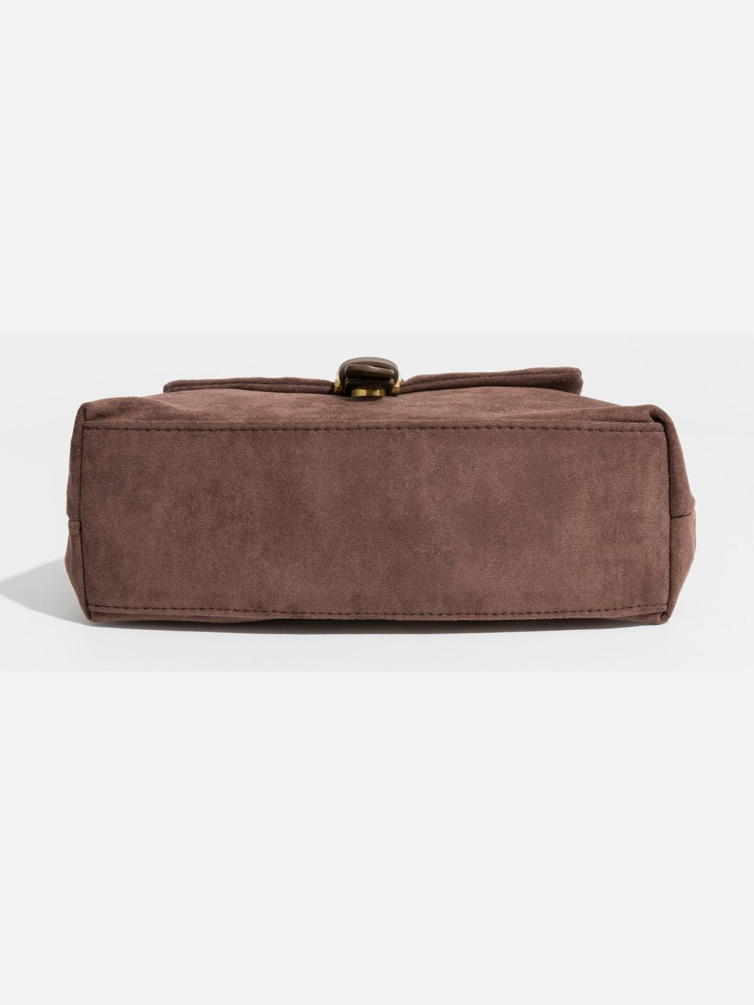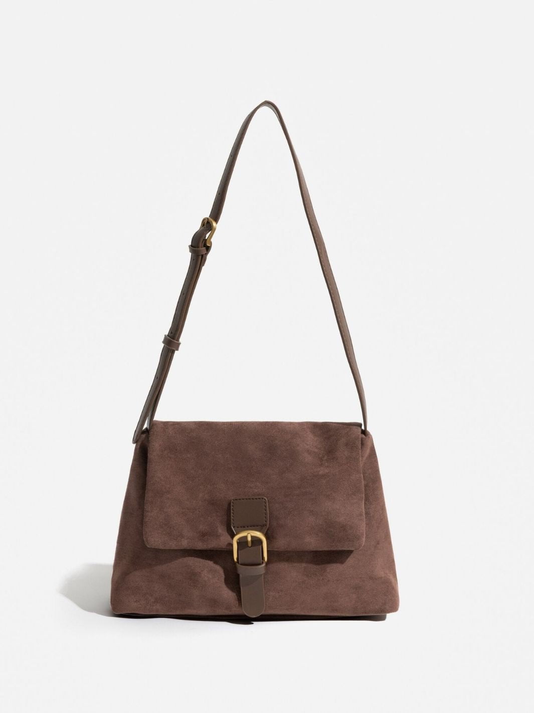 Alliant élégance structurée et douceur du daim, ce sac trapèze à bandoulière séduit par son allure intemporelle. Sa silhouette géométrique, sublimée par une boucle décorative dorée, lui confère une personnalité affirmée, idéale pour celles qui aiment conjuguer modernité et raffinement.