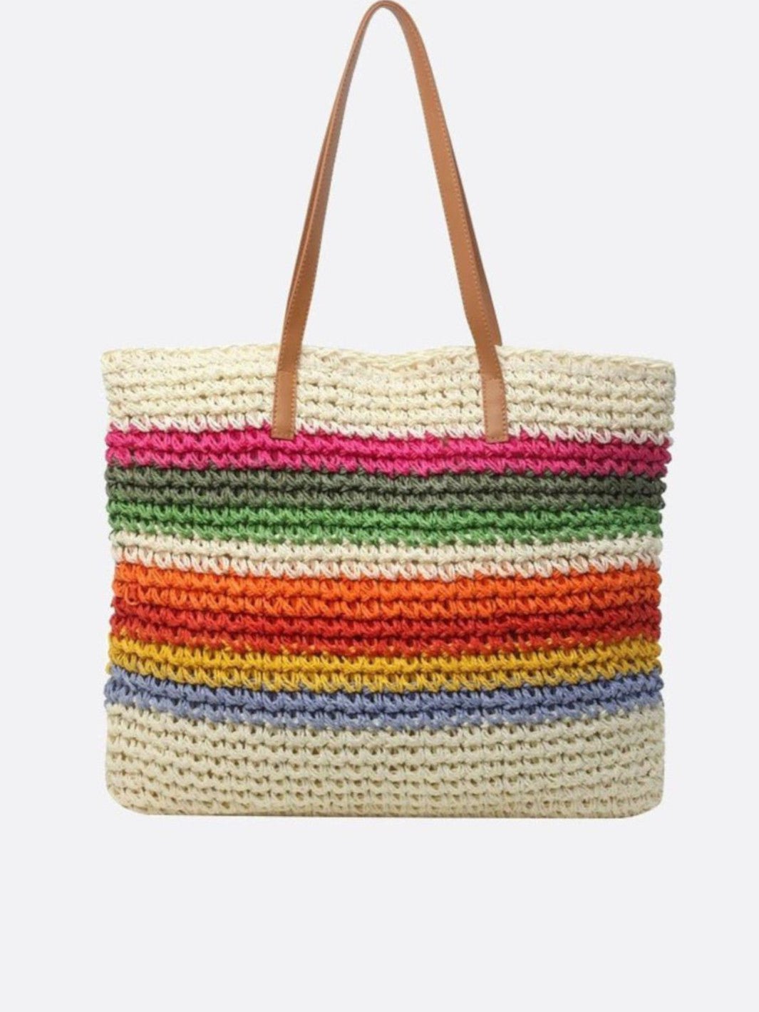 Ce cabas rayé en paille illumine la silhouette par ses bandes colorées qui se succèdent avec harmonie. Son tressage généreux lui donne un relief texturé et vivant, parfait pour apporter une touche de gaieté aux journées estivales.