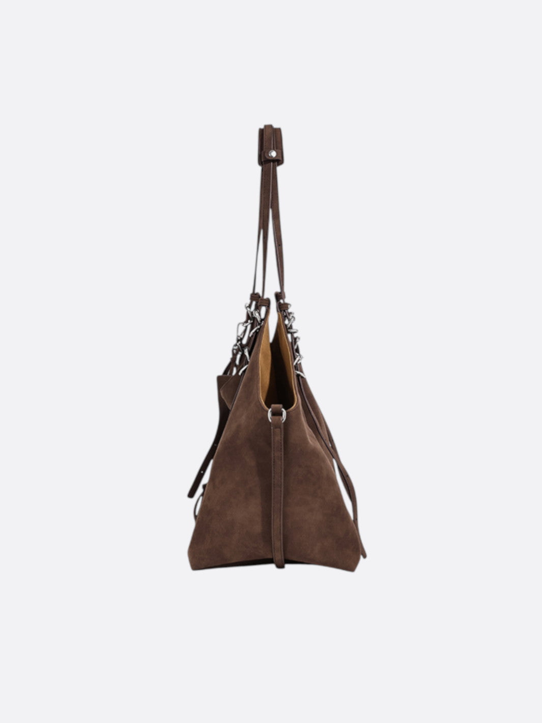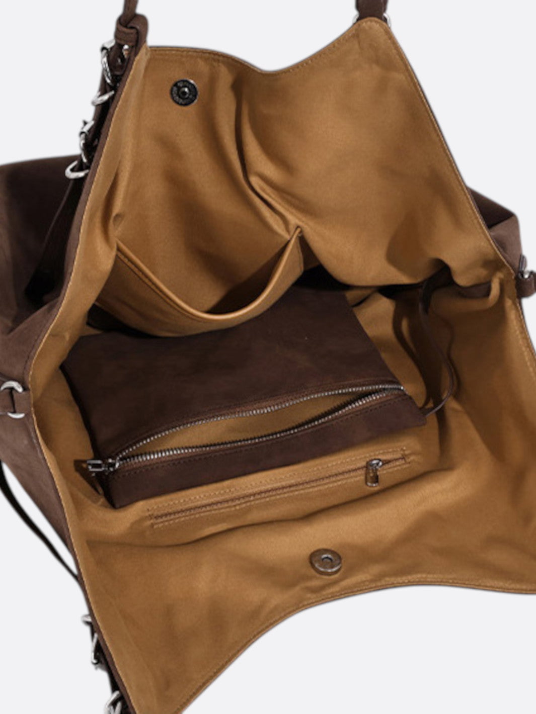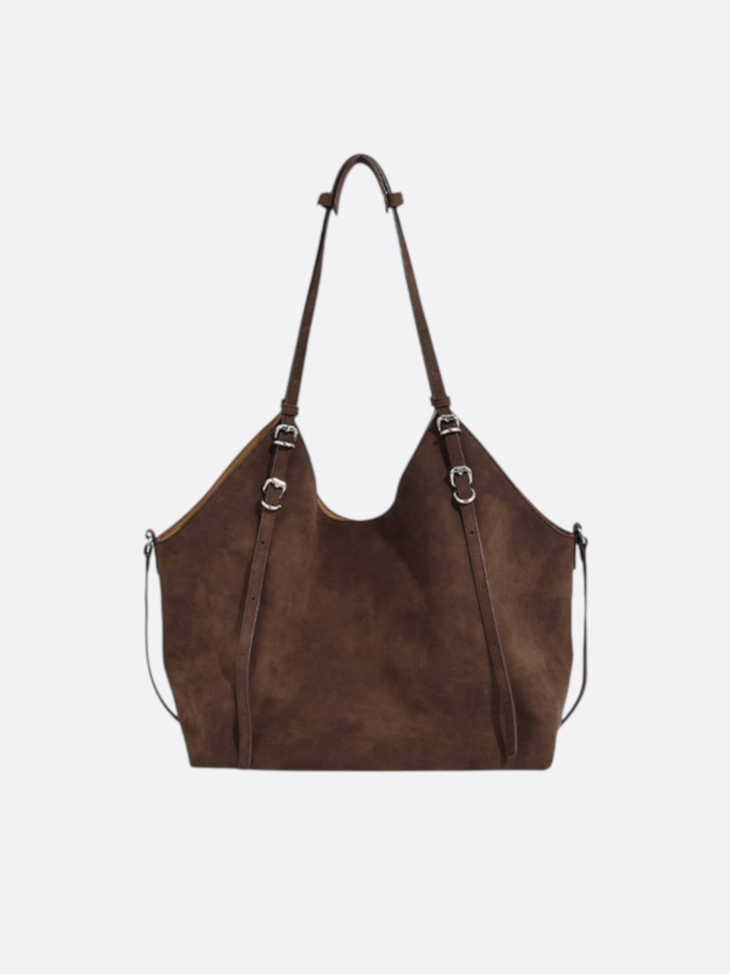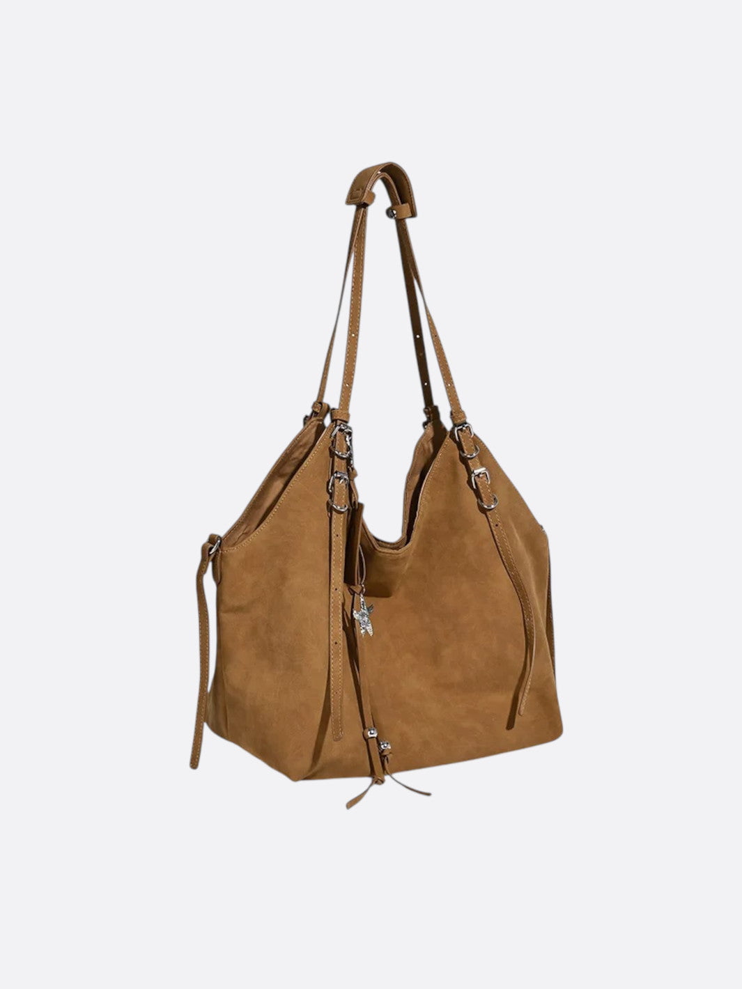Il y a des sacs qui trouvent immédiatement leur place dans une silhouette, comme s’ils en connaissaient les lignes avant même d’être portés. Ce fourre-tout en finition daim appartient à cette catégorie rare. Sa matière douce et veloutée apporte une chaleur subtile, presque enveloppante, qui transforme la tenue sans jamais la surcharger. Il accompagne les mouvements avec une souplesse généreuse, donnant à la gestuelle une allure naturellement assurée.