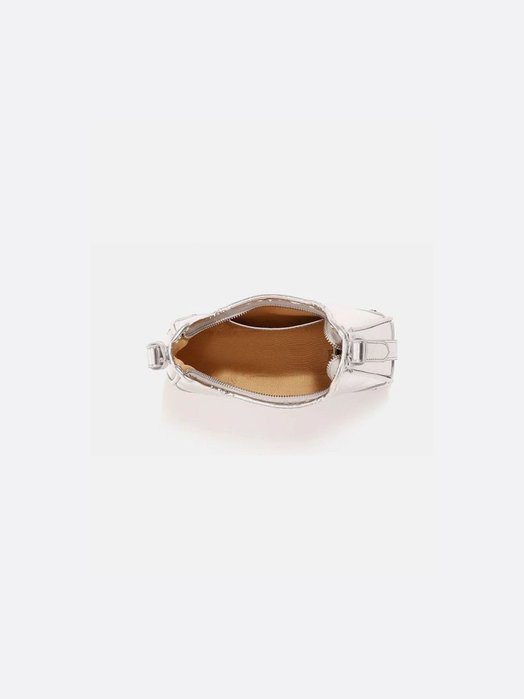 Éclatant et audacieux, ce sac porté épaule argenté attire tous les regards. Sa surface métallisée reflète la lumière avec intensité, apportant une touche de modernité assumée à chaque silhouette.