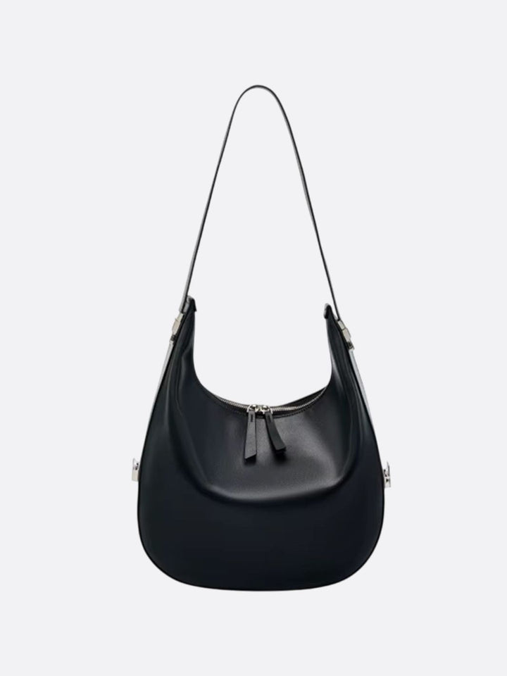 Designed for shoulder carry, it offers a flawless drape thanks to its adjustable strap that adapts with ease. The metal zipper highlights the whole with a sober and refined line, while the silver finishes punctuate its design with an urban touch.