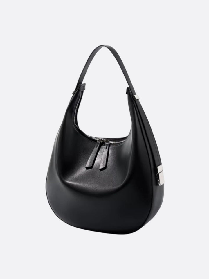 A generous volume, a perfectly mastered curved line, a strong and feminine look: this large half-moon leather bag embodies a contemporary vision of elegance. Its sculptural silhouette, softened by the natural curve of the leather, accompanies everyday movements with style.