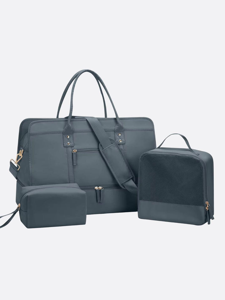 Traveling in style becomes naturally simple thanks to this 3-piece set designed for those who like to organize their belongings with as much elegance as efficiency. The travel bag comes with a matching cosmetic case and toiletry bag, forming a harmonious trio that turns every departure into a smooth and perfectly orchestrated moment.